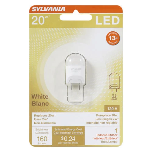 The most common applications for the Sylvania two-watt G8 2,700 kelvin LED light bulb are in general use locations. The energy-saving LED light bulb offers a substitute for incandescent bulbs. Producing a similar light output in lumens, the LED light bulb provides 92 percent energy savings compared to traditional incandescent bulbs. With a rated life of 15,000 hours, the LED light bulb lasts up to 15 times longer than traditional incandescent bulbs. This Sylvania LED light bulb features a high color rendering index (CRI) of 82. This bulb is an attractive option for residential, hospitality, healthcare, and retail applications.