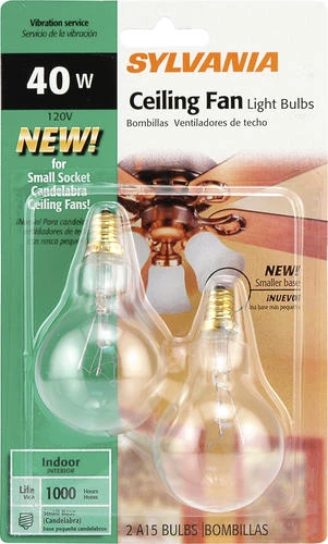 The most common applications for the Sylvania® 40-Watt A15 Clear Candle Base Ceiling Fan Incandescent Light Bulbs are in general-use locations. These light bulbs come in a convenient two pack.