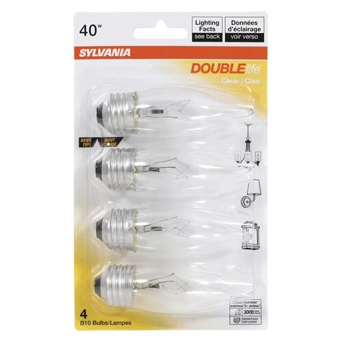 The SYLVANIA exclusive family of Double Life products last twice as long as conventional lamps. Double Life lamps are ideal for fixtures that are used frequently or are in hard-to-reach areas. The most common application for the SYLVANIA 25-Watt B10 Incandescent Light Bulbs is anywhere decorative light is desired. These light bulbs come in a convenient 4-pack and have a CRI of 100.