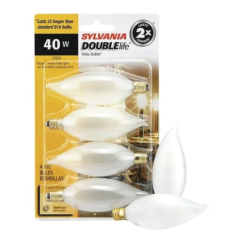 The SYLVANIA exclusive family of Double Life products last twice as long as conventional lamps. Double Life lamps are ideal for fixtures that are used frequently or are in hard-to-reach areas. The most common application for the SYLVANIA 25-Watt B10 Incandescent Light Bulbs is anywhere decorative light is desired. These light bulbs come in a convenient 4-pack and have a CRI of 100.
