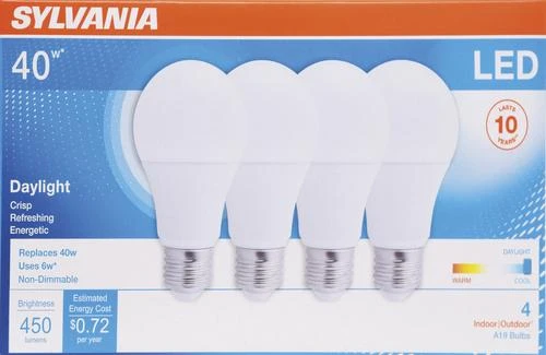 The most common applications for the Sylvania six-watt A19 5,000 kelvin LED light bulb are general use locations. The energy-saving LED lamp offers a substitute for 40-watt incandescent lamps. Producing a similar light output in lumens, the LED lamp provides 85 percent energy savings compared to traditional incandescent lamps. With a rated life of 11,000 hours, the LED lamp lasts up to 10 times longer than traditional incandescent lamps. This Sylvania lamp features high color rendering of 80 and is a non-dimmable, low-cost option. This lamp is an attractive option for residential, hospitality, healthcare, and retail applications.