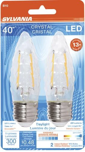 Sylvania LED crystal B10 light bulbs feature a decorative design with crystal-glass effect and an exposed filament that deliver a look and feel that is reminiscent of classic incandescent bulbs. These filament light bulbs create an inviting ambiance in any room, making them ideal for exposed bulb applications such as chandeliers and pendants. Sylvania LED crystal B10 light bulbs offer energy efficiency, longer life, and optimal illumination compared to their traditional counterparts, making them smart choices for any residential or commercial applications.
