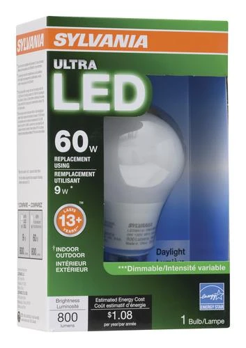 The most common application for the Sylvania® 60 watt omni-directional LED light bulb is in a general use location. The energy-saving ultra LED lamp offers a substitute for 40 watt incandescent lamps. Producing a similar light output in lumens, the ultra LED lamp provides 85 percent energy savings compared to traditional incandescent lamps. With a rated life of 15,000 hours, the LED lamp lasts up to 15 times longer than traditional incandescent lamps. This ultra-high performance lamp features a high color-rendering index of 80. These features make the new LED lamp an attractive option for residential, hospitality, healthcare, and retail applications.