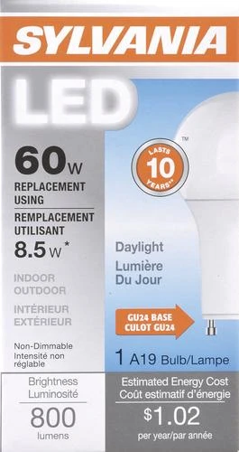 The most common applications for the Sylvania 60-watt A19 5,000 kelvin LED light bulb are in general use locations. The energy-saving LED light bulb offers a substitute for incandescent bulbs. Producing a similar light output in lumens, the LED light bulb provides 86 percent energy savings compared to traditional incandescent bulbs. With a rated life of 11,000 hours, the LED light bulb lasts up to 10 times longer than traditional incandescent bulbs. This Sylvania LED light bulb features a high color rendering index (CRI) of 82. This bulb is an attractive option for residential, hospitality, healthcare, and retail applications.