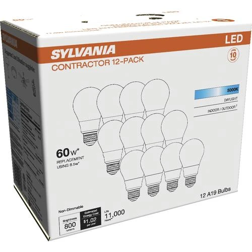 The most common applications for the Sylvania® 60 watt equivalent A19 5,000 kelvin LED light bulb are in general use locations. The energy-saving LED lamp offers a substitute for incandescent lamps. Producing a similar light output in lumens, the LED lamp provides 85 percent energy savings compared traditional incandescent lamps. With a rated life of 11,000 hours, the LED lamp lasts up to ten times longer than traditional incandescent lamps. This Sylvania® lamp features a high color rendering of 82 and is a non-dimmable, low-cost option. This lamp is an attractive option for residential, hospitality, healthcare, and retail applications.