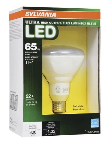The most common applications for the Sylvania® 11 watt equivalent BR30 cool white 2,700 kelvin dimmable high-output flood LED light bulb are in directional-use locations. The energy-saving ultra LED lamp offers a substitute for 65 watt incandescent lamps. Producing a similar light output in lumens, the ultra LED lamp provides 83 percent energy savings compared to traditional incandescent lamps. With a rated life of 25,000 hours, the LED lamp lasts up to 25 times longer than traditional incandescent lamps. This ultra-high performance lamp features a high color rendering of 80. These features, plus being dimmable, makes the new LED lamp an attractive option for residential, hospitality, healthcare, and retail applications.