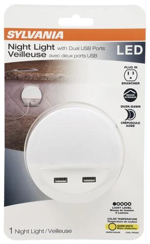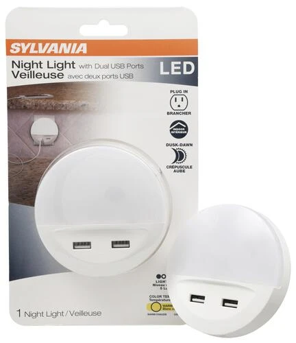 Sylvania dual USB nightlight features 2-USB charging ports to ensure that you always have enough space to charge your devices. This product operates on a dusk to dawn or can be switched to automatic on/off as needed. The perfect nightlight without sacrificing charging space in your home.