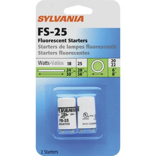 The most common applications for the Sylvania FS-25 Fluorescent Starters for F25, F18 and T8 Preheat Lamps are fluorescent fixtures. These starters come in a convenient 2-pack.